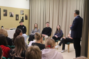 Balandžio 8 d. Punsko licėjaus mokiniai dalyvavo susitikime su šios mokyklos absolventais: Brigita Krakauskaite, Faustina Radzevičiūte, Rimu…